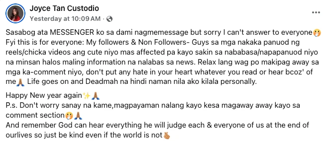 Bilang tugon sa patuloy na messages at reaksyon, naglabas si Joyce ng isang opisyal na Facebook post na agad ding kumalat online. Sa kanyang mensahe, ipinakita niya ang pagiging kalmado at mature sa gitna ng kontrobersya.